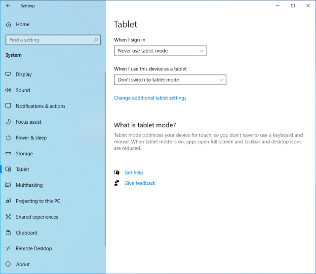 ซึ่งถ้ายังอยากใช้ Tablet Mode ก็ต้องเข้าไปที่ System > Tablet แล้วไปตั้งค่าตรงนั้นแทน แต่มันจะไม่เปลี่ยนทันทีแบบแต่ก่อนแล้ว หากอยากให้เปลี่ยนทันทีต้องเข้าไปที่ Change additional tablet settings แล้วไปกดเปิดอีกที อยู่ลึกแบบนี้ถ้ายังเผลอเปิดโดยไม่ตั้งใจก็ไม่รู้จะว่าไงแล้ว😅
